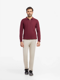 - Style: Full Sleeves Sweater with Drop Needle Pattern, Polo Collar, & Zip on Front